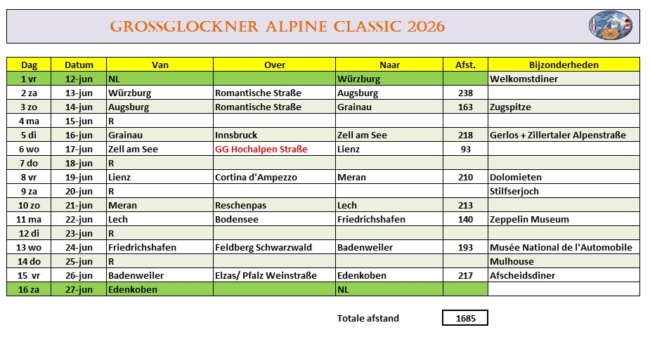 - Reisdata: 12 juni 2026 vertrek uit NL naar Würzburg, de startplaats van de rit. Finish in de Pfalz op 26 juni.